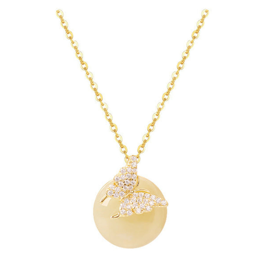 Elegante Kette mit rundem Hetian-Jade-Anhänger, gekrönt von einem funkelnden Schmetterling. Ein natürlich-zartes Statement, das sowohl im Alltag als auch zu besonderen Anlässen glänzt.
