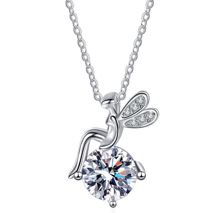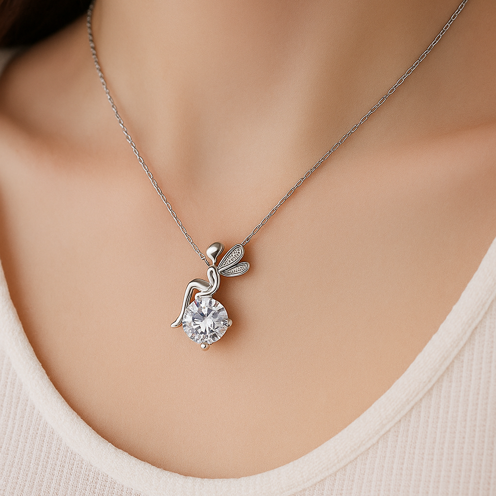 Diese bezaubernde Halskette aus 925 Sterling Silber vereint märchenhafte Eleganz mit luxuriösem Glanz. Die filigrane Fee mit funkelnden Flügeln hält einen schimmernden 1-Karat-Moissanit – ein Symbol für Licht, Hoffnung und Magie. Perfekt als Geschenk für Träumerinnen, Romantikerinnen und alle, die das Besondere lieben.