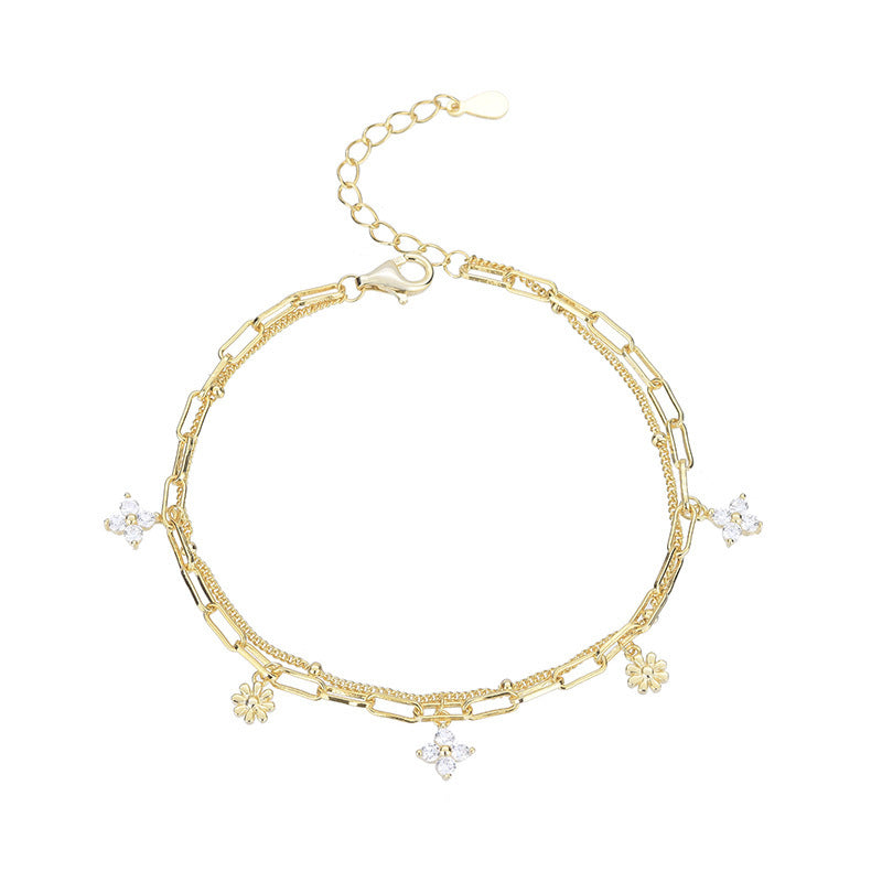 Das goldene Charm-Klee-Armband kombiniert zarte Eleganz mit modernem Stil. Die feine Gliederkette wird durch funkelnde vierblättrige Kleeblatt- und Blütenanhänger veredelt – ein Symbol für Glück und weibliche Leichtigkeit. Ob einzeln getragen oder in Kombination mit anderen Schmuckstücken, dieses Armband verleiht jedem Look eine luxuriöse Note.