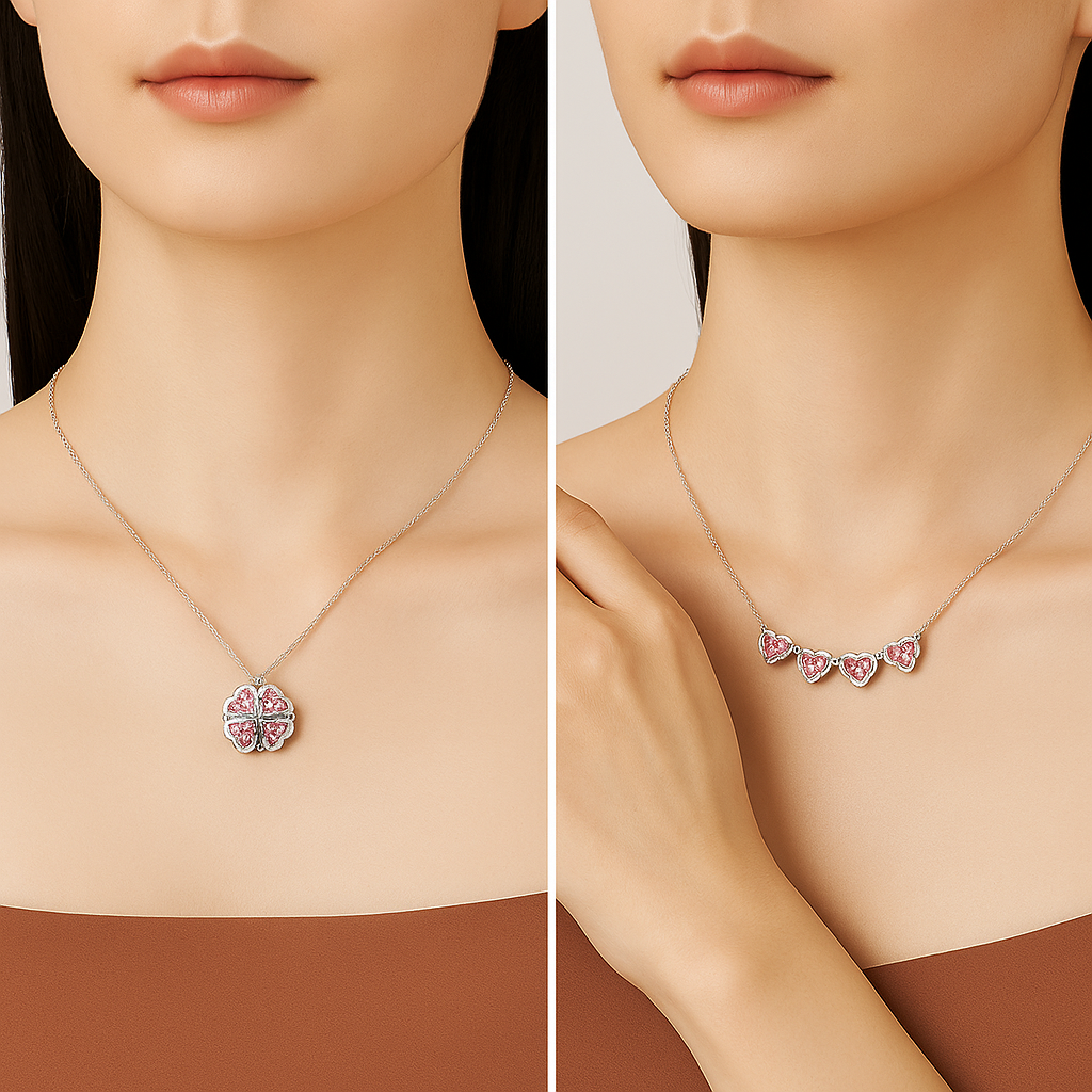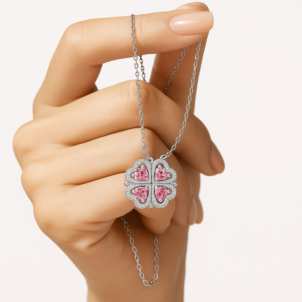 Dank ihres magnetischen Designs lässt sich das Schmuckstück flexibel tragen: geschlossen als elegantes Kleeblatt oder geöffnet als Reihe funkelnder Herzen. Ein stilvoller Begleiter für jeden Tag und ein bedeutungsvolles Geschenk für einen besonderen Menschen.