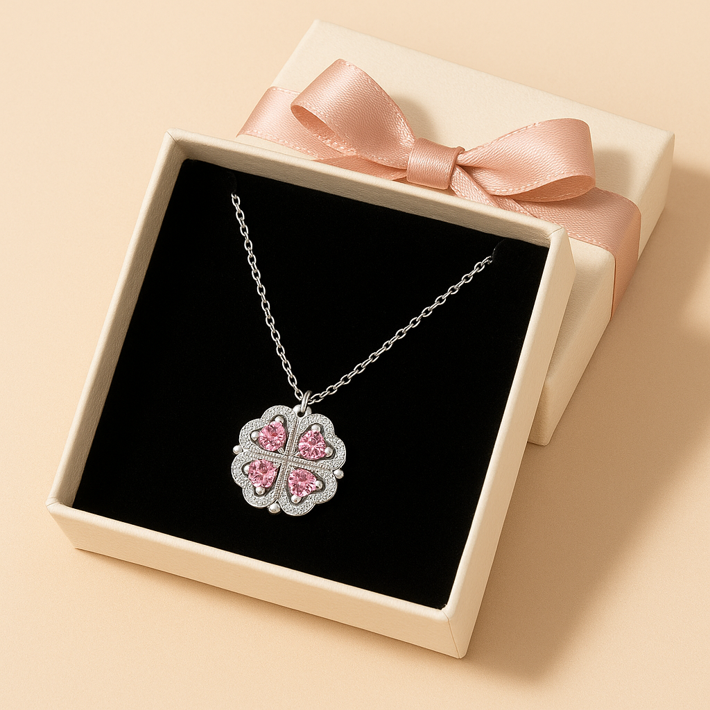 Die Herzblatt Glücksklee Halskette vereint Liebe und Glück in einem einzigartigen Design. Vier zarte, herzförmige Steine aus funkelndem rosafarbenem Zirkonia bilden gemeinsam ein filigranes Kleeblatt – ein Symbol für Hoffnung, Liebe, Glück und Vertrauen.