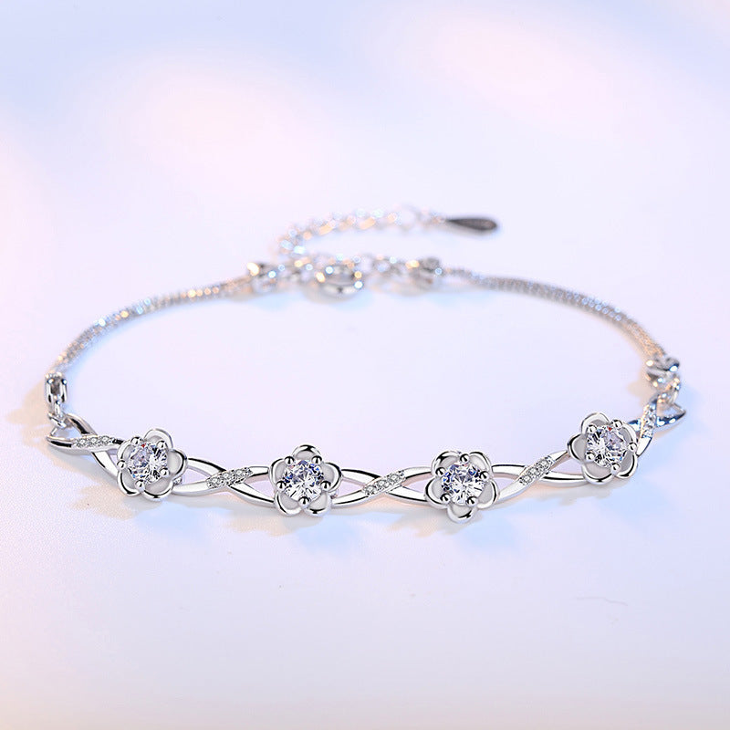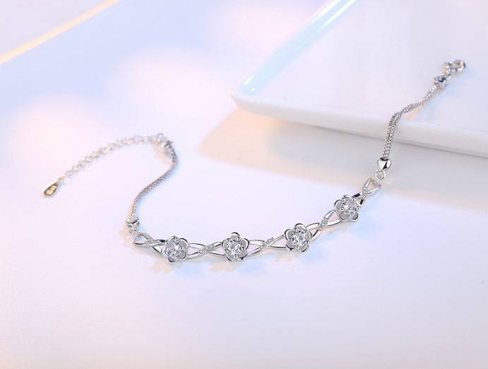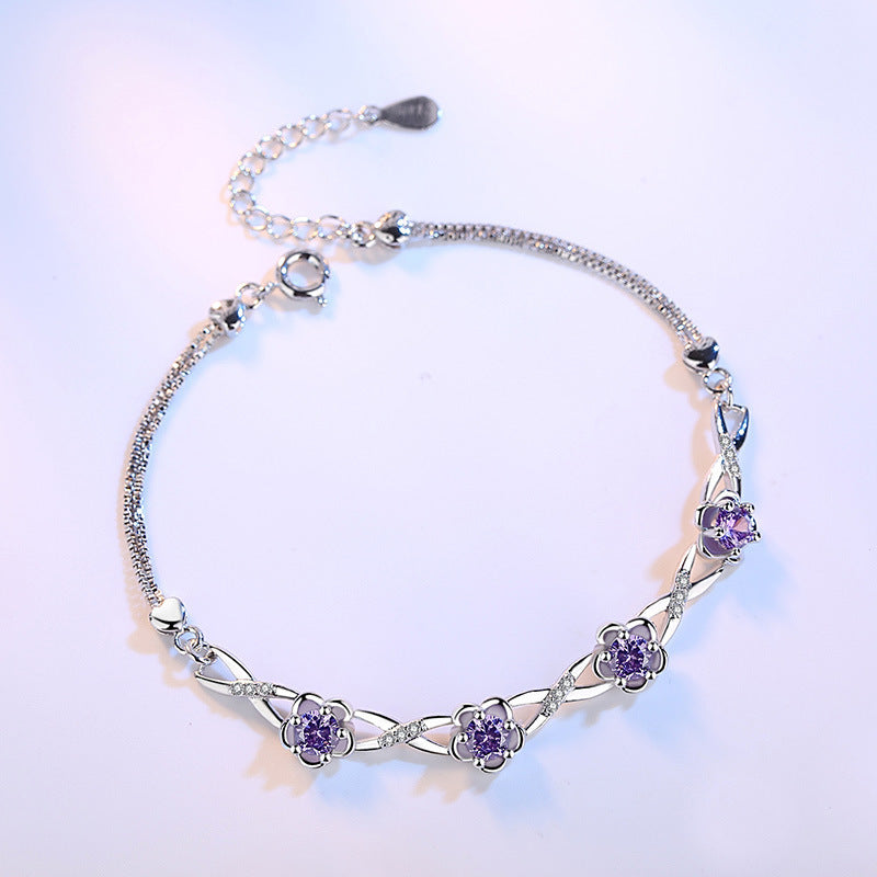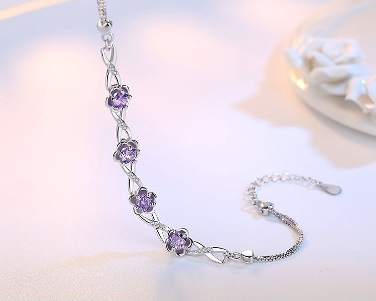 Das Peach Blossom Armband fängt die zarte Schönheit der Pfirsichblüte in funkelndem Silber ein. Die filigranen Blütenmotive sind mit feinen violetten oder silbernen Zirkoniasteinen besetzt und verleihen deinem Look einen luxuriösen Glanz. Ein elegantes Schmuckstück, das Romantik und Stil harmonisch vereint.